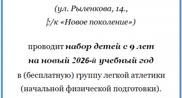 Спортивная школа олимпийского резерва «Юность России» (ул. Рыленкова, 14., с/к«Новое поколение») проводит набор детей с 9 лет на новый 2026-й учебный год в (бесплатную) группу легкой атлетики (начальной физической подготовки). тел.: 8-910-761-43-11
