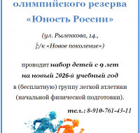 Спортивная школа олимпийского резерва «Юность России» (ул. Рыленкова, 14., с/к«Новое поколение») проводит набор детей с 9 лет на новый 2026-й учебный год в (бесплатную) группу легкой атлетики (начальной физической подготовки). тел.: 8-910-761-43-11